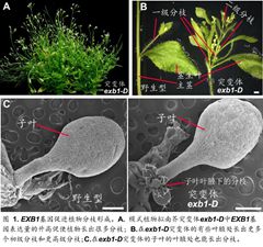 北京大学生命科学学院秦跟基教授课题组通过正向遗传学方法鉴定了一个促进植物分枝增多的基因,命名为“过多分枝”(EXCESSIVE BRANCHES 1,EXB1)。在突变体exb1-D中EXB1基因的表达量的升高,植物就长出很多分枝(图1A),而且有些叶腋处长出更多个初级分枝和更高级分枝(图1B),甚至在子叶的叶腋处也能长出分枝(图1C)。这说明EXB1基因可促进腋芽干细胞的形成,甚至可以在正常情况下不能形成腋芽干细胞的部位也能形成腋芽干细胞。他们通过研究发现,EXB1基因编码一个植物中特有的WRKY类转录因子。EXB1通过调控RAX基因的表达来促进分枝,而且体内和体外实验证明EXB1是直接结合到RAX基因的启动子区,从而调控RAX基因的表达。同时,植物激素生长素也在EXB1促进植物分枝形成的过程中起重要作用。