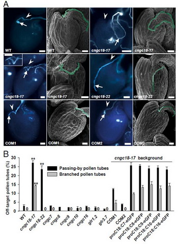 植物的花粉管生长方向受到来自胚珠的引导信号的精细调控,确保花粉管准确找到胚珠珠孔,并进入胚珠,从而使两个精子细胞被送入胚珠,完成双受精。其中,花粉管顶端质膜Ca2+通道被认为是控制花粉管生长方向的核心功能蛋白,通过介导和精细调控胞外Ca2+内流,调控花粉管顶端Ca2+浓度梯度,从而进一步调控花粉管的生长方向。因此,花粉管顶端质膜Ca2+通道就成为从胚珠引导信号到花粉管本身对胚珠引导信号的感知和应答系统这一完整信号链的关键环节。但该Ca2+通道的遗传身份几十年来一直是未知的,其通过介导和调控胞外Ca2+内流,从而调控花粉管生长方向的假说也一直缺乏遗传学证据的支持。该研究发现CNGC18是控制拟南芥花粉管生长方向最主要的一个质膜Ca2+通道,并用遗传学证据证实了其通过调控花粉管顶端Ca2+浓度梯度的动态变化,从而调控花粉管生长方向的假说。该研究很好地解决了这一植物生殖生物学领域的重要科学问题,为进一步解析整个花粉管生长方向的信号调控网络打开了一个突破口。