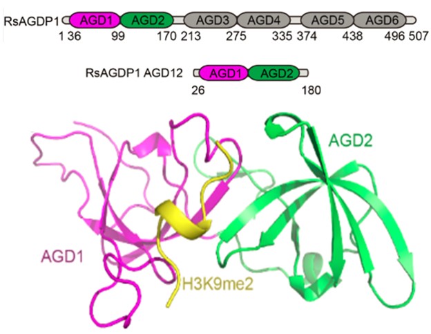 为了寻找新的H3K9甲基化标记的阅读器,本项工作的研究人员用质谱的方法检测花细胞核提取物,发现了一个未知蛋白含有AGD结构域,并将其命名为AGDP1(Agenet domain-containing protein1)。生化结果显示AGDO1可以特异性结合H3K9me2标记。继而,研究人员又解析了AGDP1的AGD12结构域和H3K9me2小肽的复合物晶体结构。从整体的结构中我们可以看到,AGD12结构域对H3K4以及H3K9me2分别进行特异性的识别。