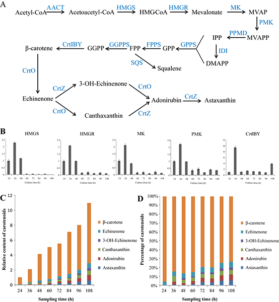 图1 Aurantiochytrium sp. SK4类胡萝卜素的合成途径(A),类胡萝卜素合成相关基因HMGS, HMGR, MK, PMK, CrtIBY qRT-PCR表达趋势(B)及不同发育阶段类胡萝卜素的相对含量(C)和比例(D)。
