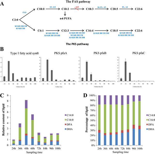 图2,Aurantiochytrium sp. SK4脂肪酸的合成途径(A),脂肪酸相关基因Type 1 fatty acid synthase、PKS subunitA、PKS subunitB及PKS subunitC的表达趋势(B)及不同发育阶段脂肪酸的相对含量(C)和比例(D)。