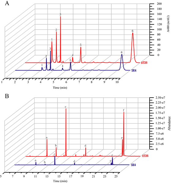 图3 工程株(AT26)和野生型(SK4)类胡萝卜素UPLC色谱图(A)及脂肪酸GC-MS色图谱。