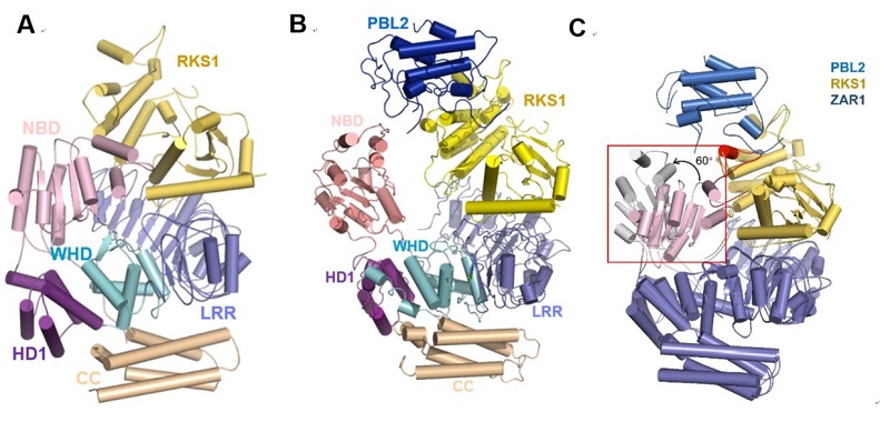 图1 植物抗病蛋白的抑制状态结构(A)、识别-启动状态结构(B)和启动机理(C)示意图