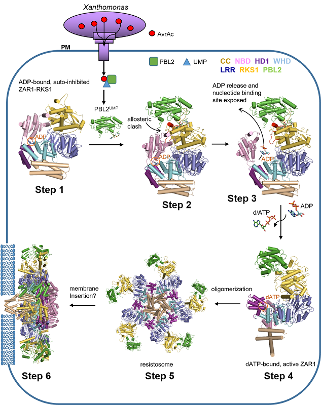 两篇文章的研究成果是通过对抑制状态复合物的结构和功能解析,阐明了抗病蛋白由抑制状态,经过中间状态,最终形成抗病小体的生化过程,合作团队紧密结合结构、生化、和功能研究,揭示了抗病小体工作机制(图3)。比如,抗病小体形成后直接在细胞质膜上发出自杀指令,很可能是植物细胞死亡和免疫执行者。该项工作填补了人们25年来对抗病蛋白认知的巨大空白,为研究其它抗病蛋白提供了范本。