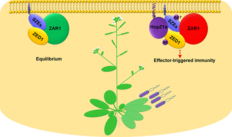 在植物的免疫反应中,病原微生物可以通过向植物体内注射效应蛋白来抑制植物的免疫反应进而增强其致病性,而植物也相应进化出了一类核苷酸结合富亮氨酸重复结构域受体蛋白(nucleotide-binding leucine-rich repeat domain-containing receptor,NLR),能够对效应蛋白进行识别,进而引起效应蛋白激发的免疫反应(effector-triggered immunity)。近年来的研究发现,大多数NLR蛋白需要与其它蛋白形成复合体来间接地识别效应蛋白。例如在拟南芥中,NLR蛋白ZAR1(HopZ-Activated Resistance 1)能够与假激酶ZED1(HopZ-ETI-Deficient 1)形成复合体识别丁香假单胞菌效应蛋白HopZ1a,而HopZ1a对ZED1的乙酰化修饰被认为能够激活ZAR1介导的免疫反应。然而,目前关于ZED1如何激活ZAR1以及HopZ1a的识别是否还需要其它组分尚不清楚。