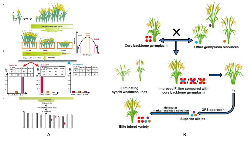图1.A)GPS定位QTL的流程;B)杂种优势基因定位及设计育种示意图(彩色圆点代表优良基因)