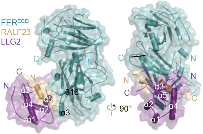 拟南芥受体激酶Feronia (FER) 是另外一类植物受体激酶CrRLK1L亚家族的成员。CrRLK1L亚家族的成员胞外具有两个特征性的与配体识别相关的串联Malectin结构域。动物Malectin是定位于内质网膜上的蛋白,可特异性识别糖类分子,与蛋白的糖基化修饰有关。植物Malectin结构域同样被报道可识别细胞壁相关多糖pectin。自FER被发现以来,分别有三篇Science文章报道了其在生殖(Escobar-Restrepo JM et al, Science 2007)、生长(Haruta M et al, Science 2014)、免疫(Stegmann M et al, Science 2017)三大植物生理过程中的重要作用。快速碱性化因子(Rapid alkalinization factor, RALF)是一类植物重要的肽类激素,其被认为是受体激酶CrRLK1L亚家族的配体。如RALF1/23被FER识别,RALF4/19由ANX1/2, BUPS1/2识别(Ge et al, Science, 2017; Mecchia MA et al, Science, 2017)等。拟南芥Lorelei (LRE)及LLG1/2/3家族是一类胞外膜锚定蛋白,有研究表明其是FER信号通路的重要参与者(Capron et al., Plant Cell, 2008; Li et al., elife, 2015)。