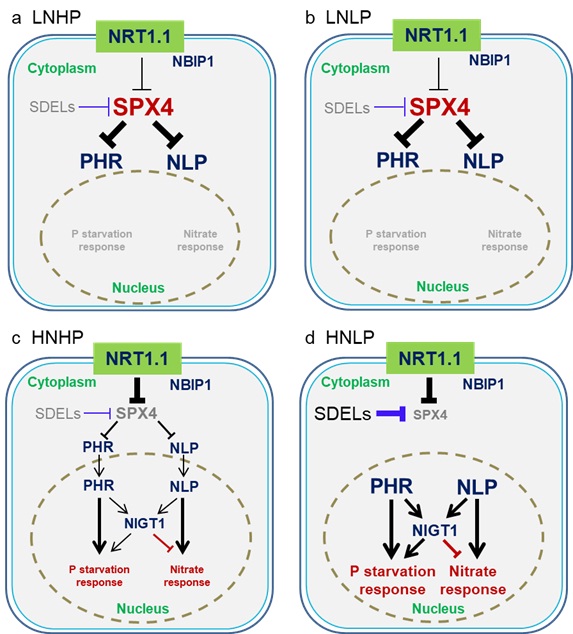 (a和b)在低硝酸盐条件下,无论磷酸盐利用率高低(LNHP或LNLP),SPX蛋白都在细胞质中高度积累,PHR和NLP滞留在细胞质中,抑制磷饥饿应答基因和硝酸盐应答基因的表达。(c)在高硝酸盐和高磷酸盐条件下,SPX蛋白部分被NRT1.1-NBIP1介导26S蛋白酶复合体降解,PHR和NLP蛋白得以释放,从细胞质穿梭至细胞核激活磷饥饿应答基因和硝酸盐应答基因的表达。在NLP和PHR转录因子的控制下,NIGT1进一步调控了磷饥饿应答基因和硝酸盐应答基因的表达。(d)在高硝酸盐和低磷酸盐条件下,NRT1.1-NBIP1和SDELS均能介导SPX蛋白降解,导致细胞质中SPX蛋白积累量极低,且PHR和NLP胞核穿梭率高,从而强烈激活磷饥饿应答基因和硝酸盐诱导基因的表达。PHR和NLP可诱导NIGT1的表达,进一步调控磷饥饿应答基因和硝酸盐反应基因的表达。蓝色、黑色和深红色条分别代表蛋白质降解、胞质核穿梭抑制和转录抑制。黑色箭头代表转录激活。线条宽度代表调节强度。