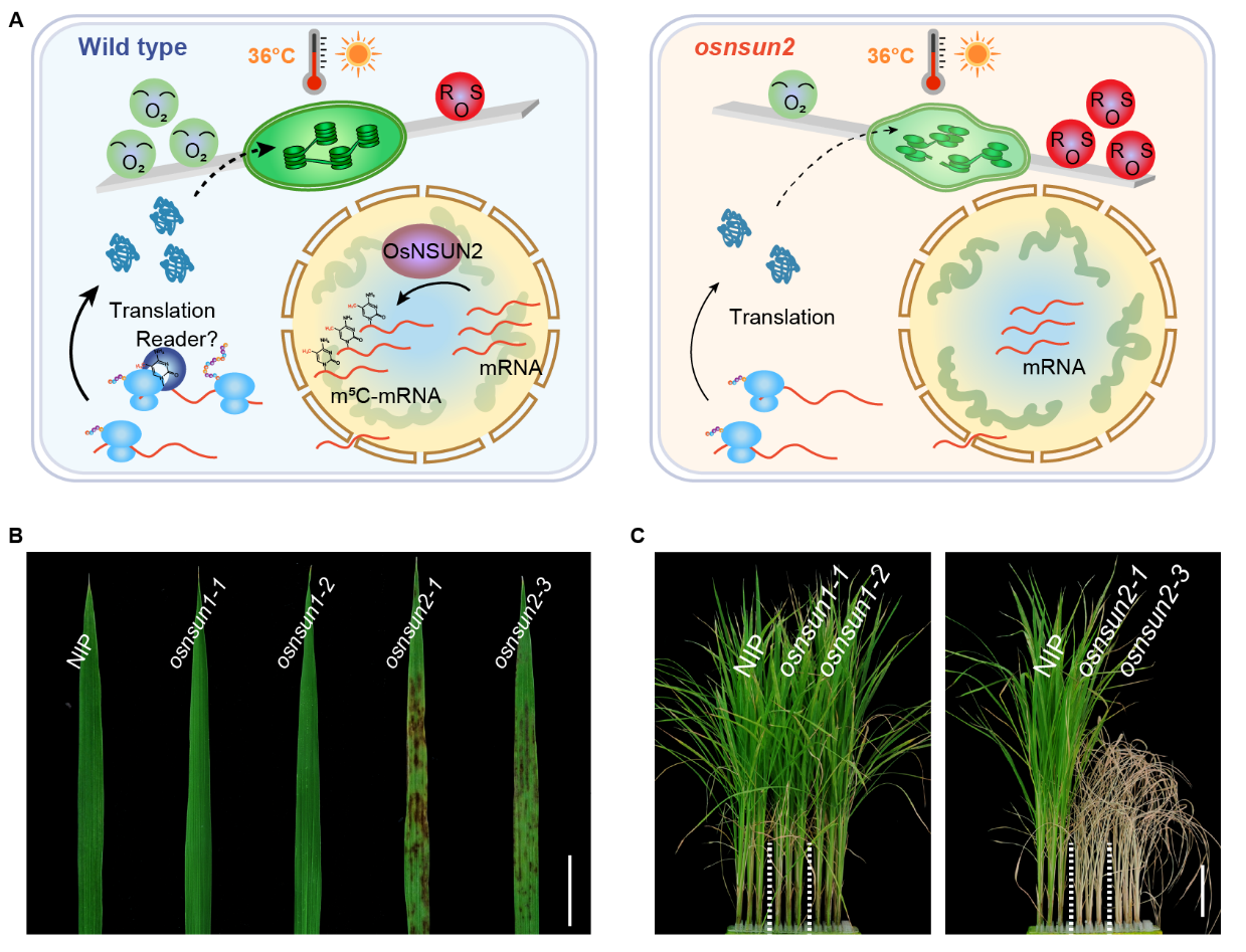 A,OsNSUN2调控水稻高温适应过程的工作模式图;B,osnsun2叶片类病斑表型;C,osnsun2植株对高温的敏感性,三叶期植株36°C处理两周并恢复培养三周后。标尺为5 cm。