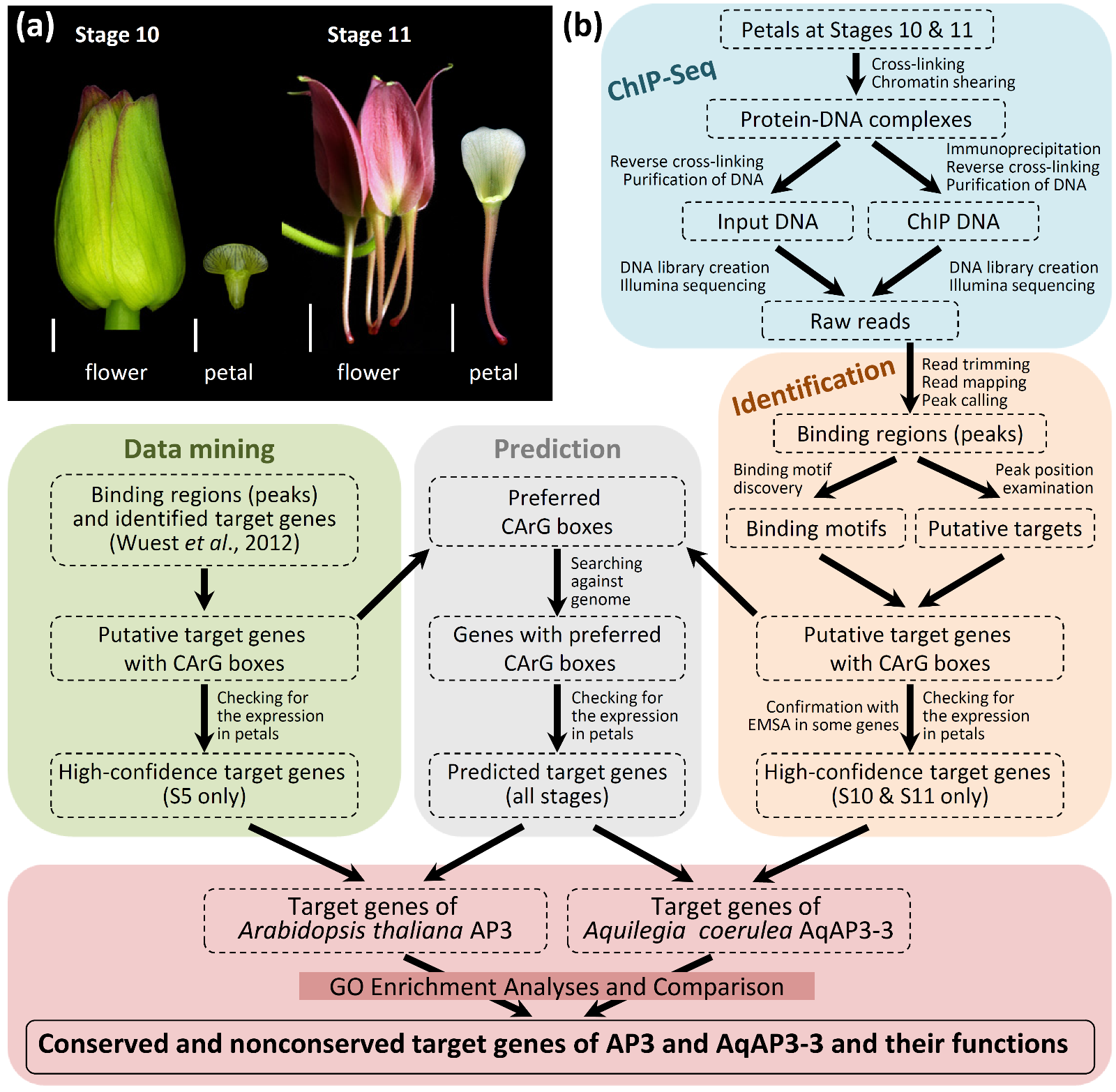 中科院植物所孔宏智研究组与徐桂霞研究组合作,以毛茛科蓝花耧斗菜(Aquilegia coerulea)为材料,利用ChIP-seq技术和生物信息学方法,鉴定了花瓣身份基因AqAP3-3的靶基因。研究发现:AqAP3-3在基因组上结合的保守序列(基序)为CArG box类型,多数位于靶基因启动子区;AqAP3-3与拟南芥AP3共享的靶基因是进化上高度保守的靶基因,主要决定花瓣身份相关的性状;进化上不保守的靶基因大多参与特有性状的形成,如蓝花耧斗菜的距、蜜腺、表皮毛和花瓣颜色等。这些结果说明花瓣身份基因在不同物种中对已有调控网络的招募或新调控关系的建立,是花瓣形态结构多样化的主要原因。该研究结果不仅是理解花瓣共性和特性的基础,而且为研究花器官身份基因与靶基因间的调控进化提供了新思路。
