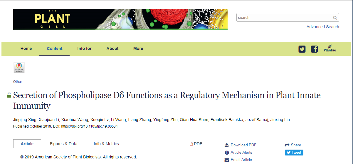 中国科学院植物所/北京林业大学林金星教授与河南大学合作在植物学知名期刊The Plant Cell上发表了题为“Secretion of Phospholipase Dδ Functions as a Regulatory Mechanism in Plant Innate Immunity ”的研究论文。