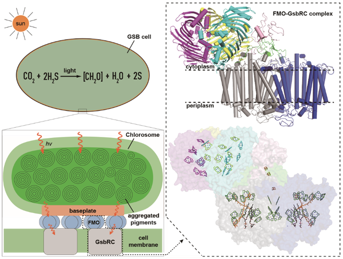 绿硫细菌的光合作用系统包括外周捕光天线绿小体(chlorosome)、内周捕光天线FMO(Fenna-Matthews-Olson)和镶嵌于细胞膜上的反应中心(GsbRC)。绿硫细菌的光反应中心为铁-硫型(type-I型),核心由两个相同的蛋白亚基构成(即同质二聚体)。绿硫细菌内周捕光天线FMO向反应中心的能量传递效率在35%-75%之间,显著低于高等植物外周天线LHCI向PSI核心的能量传递效率(接近100%)。目前,绿硫细菌的光合作用反应中心能量捕获、传递和转化的结构基础尚未被解析。