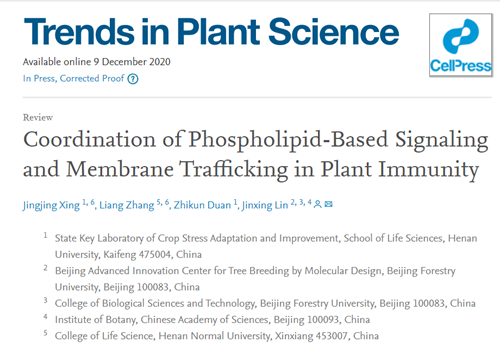 近日,北京林业大学林木分子设计育种高精尖创新中心/生物学院林金星教授与河南大学作物逆境适应与改良国家重点实验室邢晶晶博士等联合在国际知名学术期刊Trends in Plant Science上发表了题为“Coordination of phospholipid-based signaling and membrane trafficking in plant immunity”的综述论文。