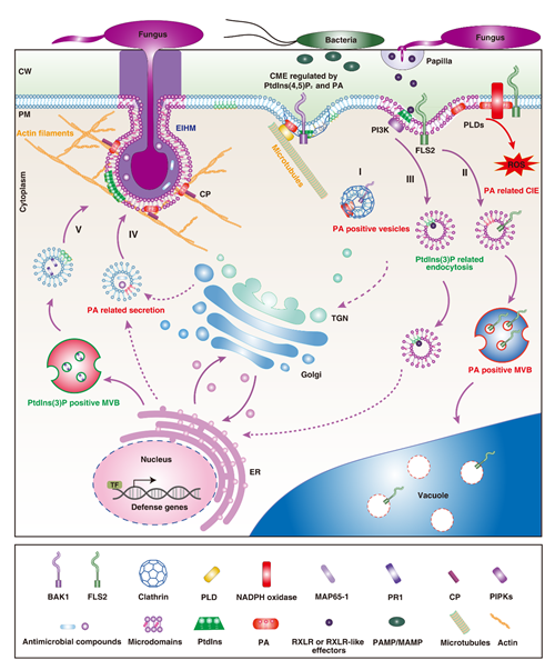 植物自身的免疫防御机制能够保护植物在生长发育过程中免受病原微生物的侵害。磷脂信号途径 (Phospholipid-based signaling) 和囊泡转运 (Membrane trafficking) 协同调控植物免疫应答过程,是连接膜上病原菌识别、传递信号以及免疫应答的重要桥梁,在植物抵御病原微生物的入侵过程中起关键作用。但是,过去对于磷脂信号途径在囊泡转运过程中的调控机制以及二者的协同作用却缺乏系统的总结。