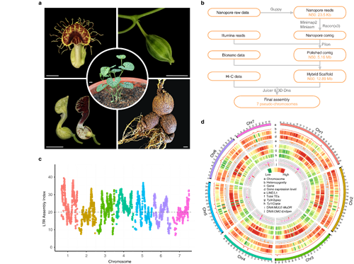 针对上述问题,中科院植物研究所焦远年研究组利用Nanopore、Bionano光学图谱和Hi-C等测序技术,对流苏马兜铃(Aristolochia fimbriata)进行了基因组测序和组装,获得了高质量的参考基因组,注释到了21,751个蛋白编码基因。研究人员通过基因组进化分析,发现流苏马兜铃自现存被子植物起源后未经历过全基因组加倍事件,是目前发现的、除ANA基部的无油樟(Amborella trichopoda)外第二个未经历过全基因组加倍的测序物种。它也因独特的基因组进化历史成为比较基因组学研究的一个重要对象,为解析其他被子植物基因组的进化及被子植物祖先基因组特征等提供了重要参考。