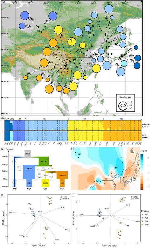 图a-d,中华蹄盖蕨复合群的南北遗传分化模式;图e-f,环境异质性与中华蹄盖蕨复合群群体遗传分化的联系。