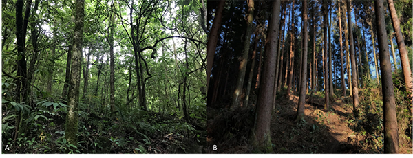 图1: 天然林与人工林景观:A-四川省大相岭省级自然保护区中的天然林;B-四川省洪雅县境内的柳杉人工林。(图片来源:华方圆)