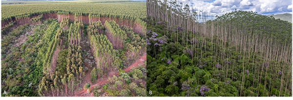 图3:创新性的天然林恢复试点:A-巴西圣保罗州Itatinga圣保罗大学森林实验站的桉树人工林景观中,通过自然恢复、人工辅助的自然恢复、人工种植多样本土植物等方式恢复天然林生态系统;在种植有桉树的实验地,桉树在种植5年后采伐,木材收入可用于帮助承担恢复项目的成本。B-巴西圣保罗州Bertioga对桉树人工林进行改造,用药剂杀死桉树,让本地植物群落自然生长,最终恢复为本地原有的大西洋雨林。(图片来源:Paulo Molin和Pedro Brancalion)