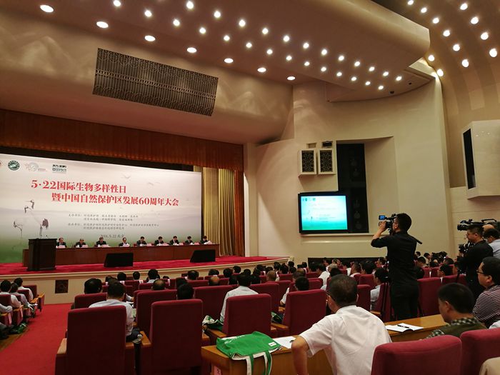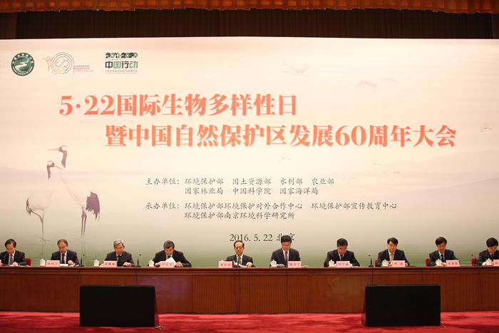 5月22日,由环境保护部、国土资源部、水利部、农业部、国家林业局、中国科学院、国家海洋局七部门联合主办的“国际生物多样性日暨中国自然保护区发展60周年大会”在北京人民大会堂召开。全国政协副主席韩启德和环境保护部部长陈吉宁出席会议并讲话,会议由环境保护部副部长李干杰主持,国务院有关部门和地方代表约600人参加会议。