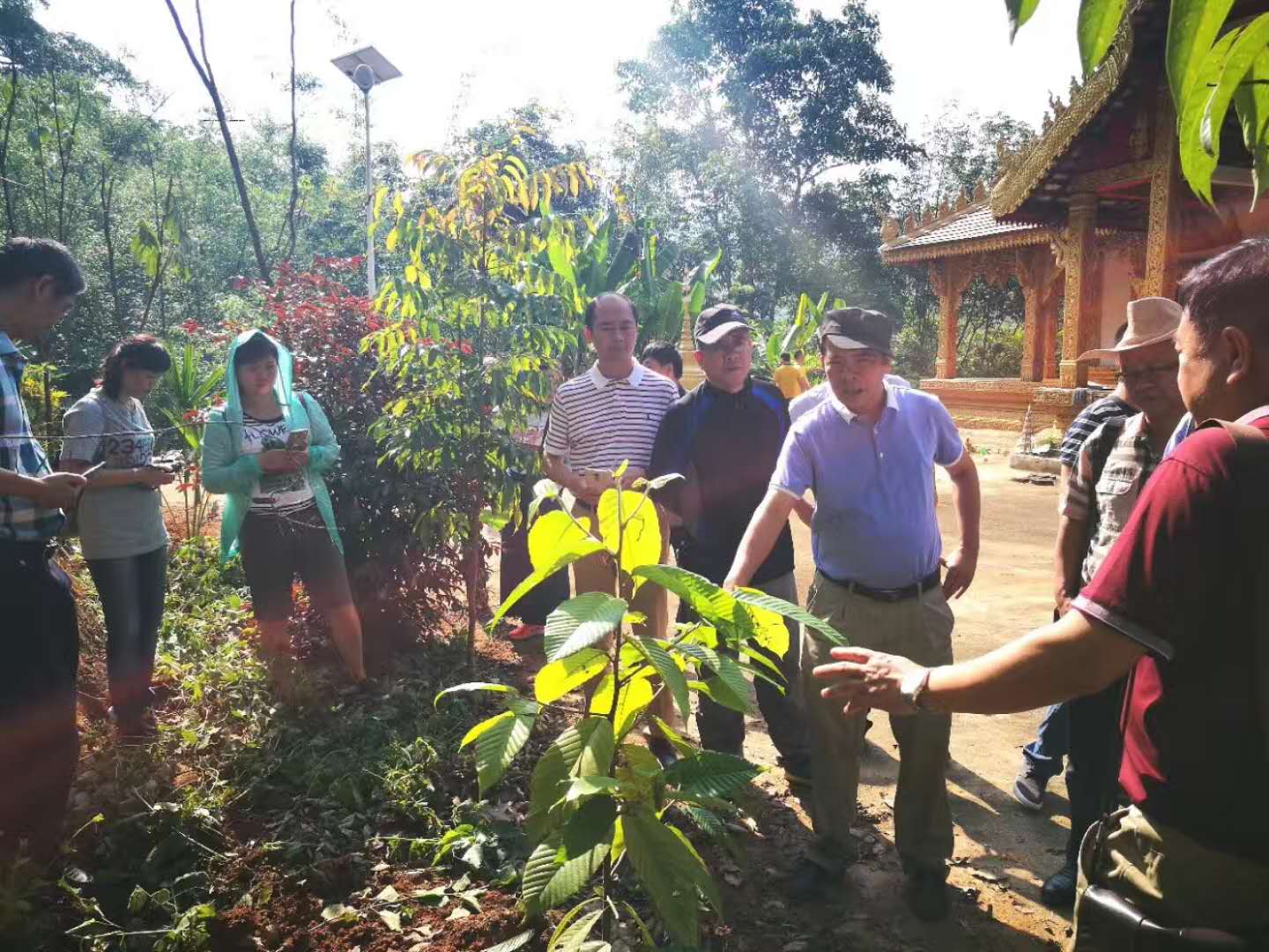 在西双版纳州傣医医院、纳板河国家级自然保护区、中国医科院药植所等单位的支持下,裴盛基教授率领的专家团队带去了美登木、鸡蛋花、泰国大风子、肾叶山蚂蝗、翅果决明、白鹤灵芝等20多个品种近400株傣药苗木,与同行的各位专家、领导一起亲手种植在村寨佛寺周围,并将其余傣药苗木赠予村民,鼓励开展庭院种植。随后,全体人员参观了曼吕村2户傣药材庭院种植示范户。