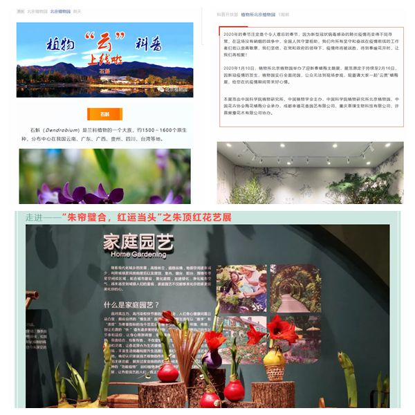 为杜绝室内传播,减少大量人员聚集,全国各地植物园积极采取措施,取消春节至今期间各项室内活动,并结合各自优势,推出多种线上活动,丰富了“抗疫”期间广大群众的文娱生活。如北京植物园在微信平台推出植物“云”科普系列活动,以每周定期放送两部科普视频的形式向粉丝展现植物之趣,让人们不出门也能学习植物知识;中科院北京植物园取消了原定持续至2月16日的迎新春腊梅主题展,邀请公众“云赏”腊梅展,以视频结合文字图片的形式生动展现腊梅之美,普及腊梅科学文化;成都植物园发布“云游成植”系列主题推文,以“云观展”和“云赏花”等形式介绍当下园内景观,弥补了花友因疫情不能亲临现场的遗憾。