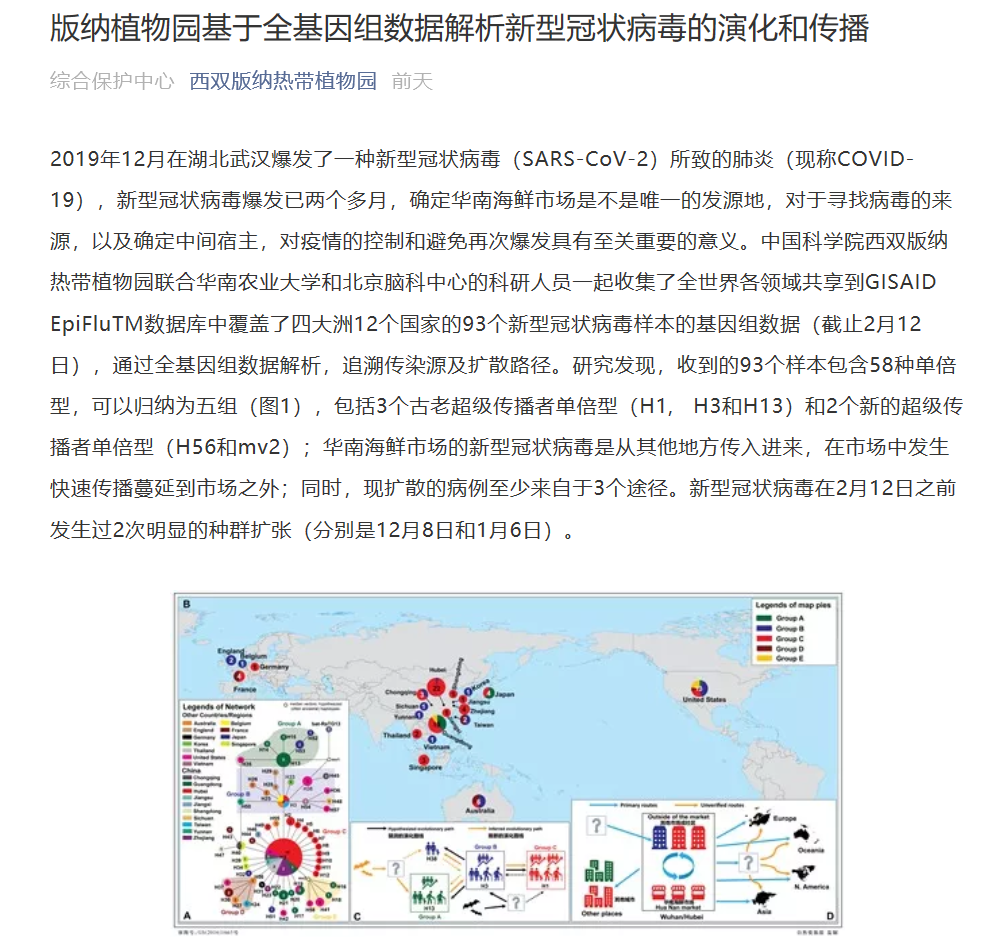 图3:中科院西双版纳植物园参与新型冠状病毒基因分析的相关报道