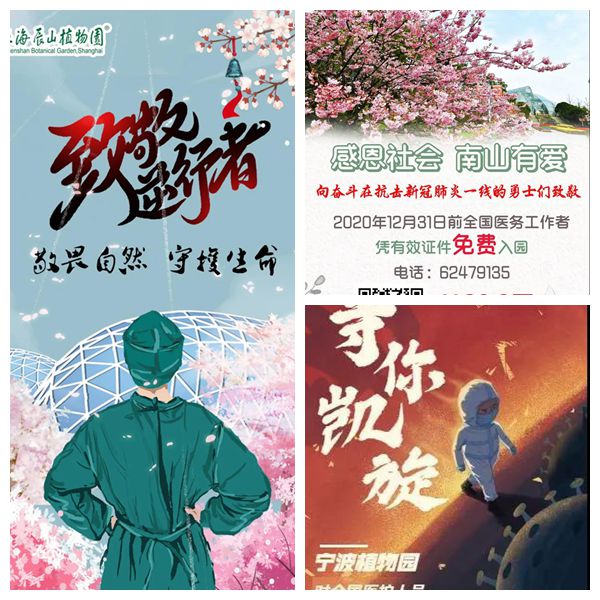 疫情期间,广大医务工作者为国家和社会做出了巨大贡献。上海辰山植物园、南京中山植物园、重庆南山植物园、宁波植物园等全国多家植物园推出活动,于2020年全年内向全国医务工作者免费开放,致敬最美“逆行者”,同时发挥植物园科普宣教平台的功能优势,助力营造尊医重卫的良好社会风尚。