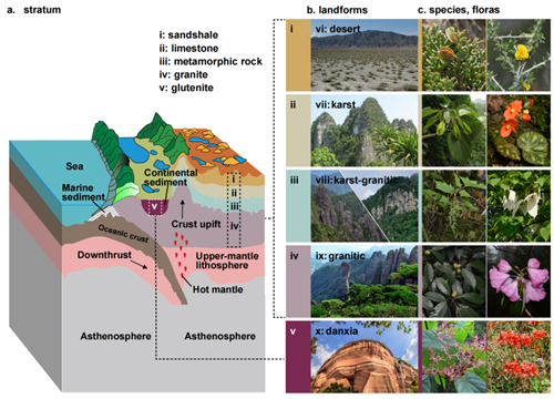 (a. 板块运动, 导致海相沉积抬升(i-iii)、侵入性花岗岩抬升(iv)、较晚的陆相沉积抬升(v); b.基岩地层因侵蚀而形成不同类型的地貌(vi-x); c. 岩性分化和地貌形成促进了偏好植物的定居和多样化,形成专性区系。荒漠地貌(vi)区系以驼蹄瓣属Zygophyllum和锦鸡儿属Caragana等为代表; 喀斯特地貌(vii)以蚬木属、秋海棠属等为代表; 混和地貌(viii)以鞘柄木属Torricellia和珙桐属Davidia等为代表; 花岗岩地貌(ix)以青冈属、杜鹃属等为代表; 丹霞地貌(x)以梧桐属Firmiana、报春苣苔属Primulina等)
