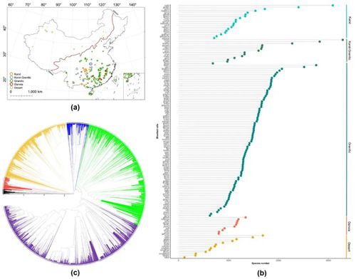 (a. 140处山地分布图; b. 五种地貌类型区系组成比较, 自下往上: 荒漠地貌13处, 丹霞10处, 花岗岩84处, 混和型14处; 喀斯特19处; c. 基于APG Ⅳ的被子植物系统树(按逆时针: 黑色, ANITA; 浅蓝,Magnoliids; 蓝色, 单子叶类; 橙色, 真双子叶类基部群; 绿色, Superrosids; 紫色, Supersterids; 用GBOTB估算分支时间)