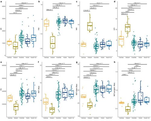 (a物种丰富度SR; b系统发育多样性指数PDI; c净相关指数NRI; d最近分类单元指数NTI; e系统发育多样性PD;f所有物种的平均分化年龄MDT; g最古老的25%物种平均年龄MDT.oldest; h最年轻的25%物种平均年龄MDT.youngest。x轴, 依次为: 丹霞10处, 荒漠13处, 花岗岩84处, 喀斯特19处, 混和14处)