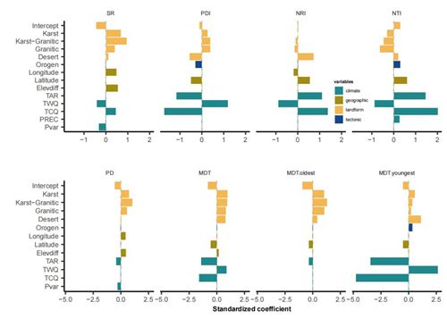 (两图以丹霞+克拉通为基准, 喀斯特、喀斯特-花岗岩、花岗岩--NTI较低, PDI较高。预测变量, 包括五种地貌类型、构造类型、地理因子(经度, 纬度, 海拔落差Elevdiff)、气候因子(等温性, TAR-温度年较差, TWQ-最热季均温, TCQ-最冷季均温, PREC-年降水量; 每个条形图的长度表示变量的解释力)