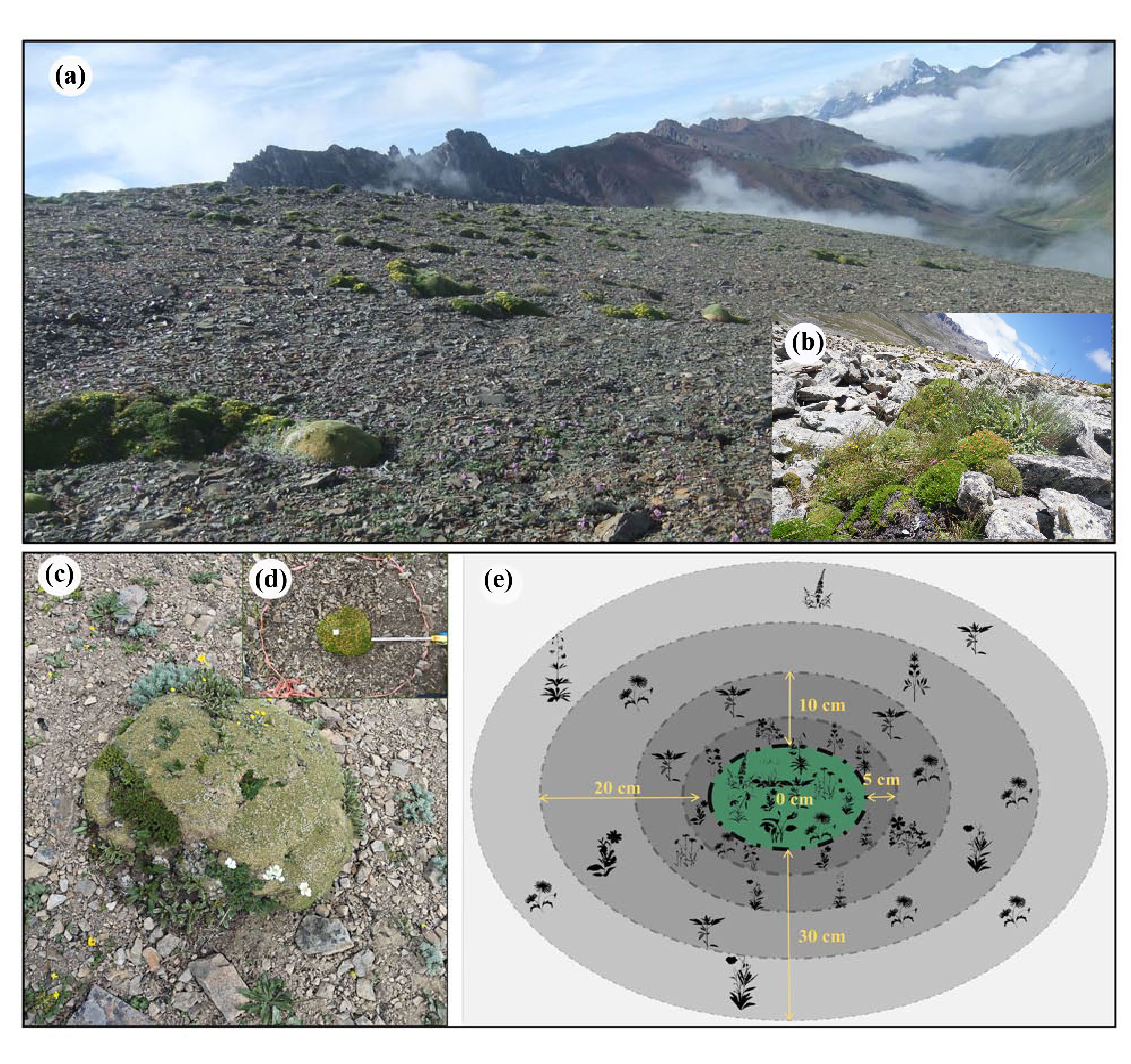 近期,中国科学院昆明植物研究所“泛第三极植物多样性形成及创新驱动专题组”以横断山高山冰缘带内广泛分布的八种典型垫状植物(团状福禄草Arenaria polytrichoides、山生福禄草Arenaria oreophila、关节委陵菜Potentilla articulata等)为研究对象开展了创新性研究(图1),证实了垫状植物护理作用在其冠层外具有较强的空间延伸性,并因此对构建植物微群落、提升群落植物多样性,进而提升生态系统功能(地面生产力)和群落稳定性产生重要作用。通过该研究,作者首次建议在探索和揭示垫状植物生态系统功能的研究中,应当将由垫状植物在一定空间尺度上所构建的植物微群落作为整体进行考虑,而不仅仅考虑其冠层内部的植物微群落。
